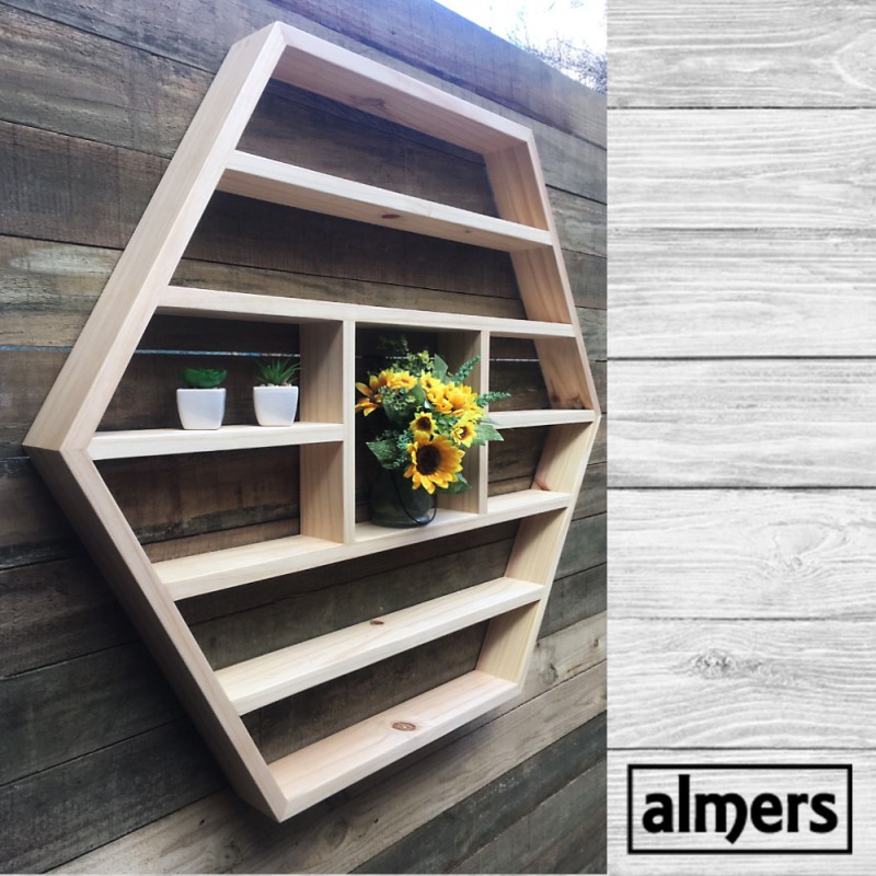 Make a bold statement with our handcrafted large hexagon display shelf, designed to bring modern geometric charm to any space. Crafted from solid pine wood, this eye-catching shelf features built-in storage, perfect for displaying plants, books, candles, or decorative pieces. Whether styled in a living room, bedroom, nursery, or office, its sleek yet rustic design adds warmth and character to your walls.